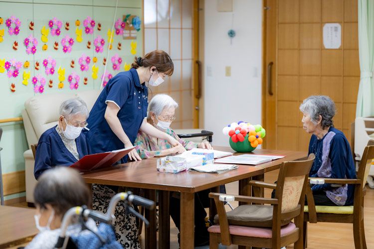 | 日常生活上の介護 | 管理栄養士による栄養バランス・健康・嗜好を考慮したバラエティに富んだ献立。 看護師による体調チェック、身体状況にあわせた快適な入浴(一般浴・機械浴) または清拭による清潔とリラクゼーションの保持。 身体状況にあわせたオムツ交換、トイレ誘導、夜間のポータブルトイレなどの排泄介助・自立支援 |